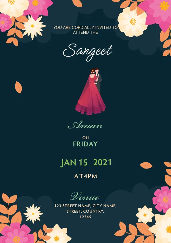 Our digital sangeet invitations are specially designed to add elegance and charm to your Sangeet ceremony. We offer a wide lineup of custom-made sangeet invitation templates that you can edit with your own details and preferences. Furthermore, you can select from various designs, colours, and fonts. Also, we have different styles to match the theme and tone of your invitation card for sangeet ceremony.
